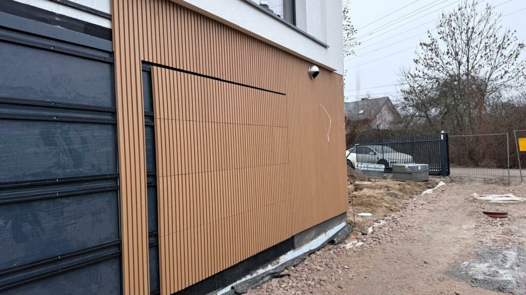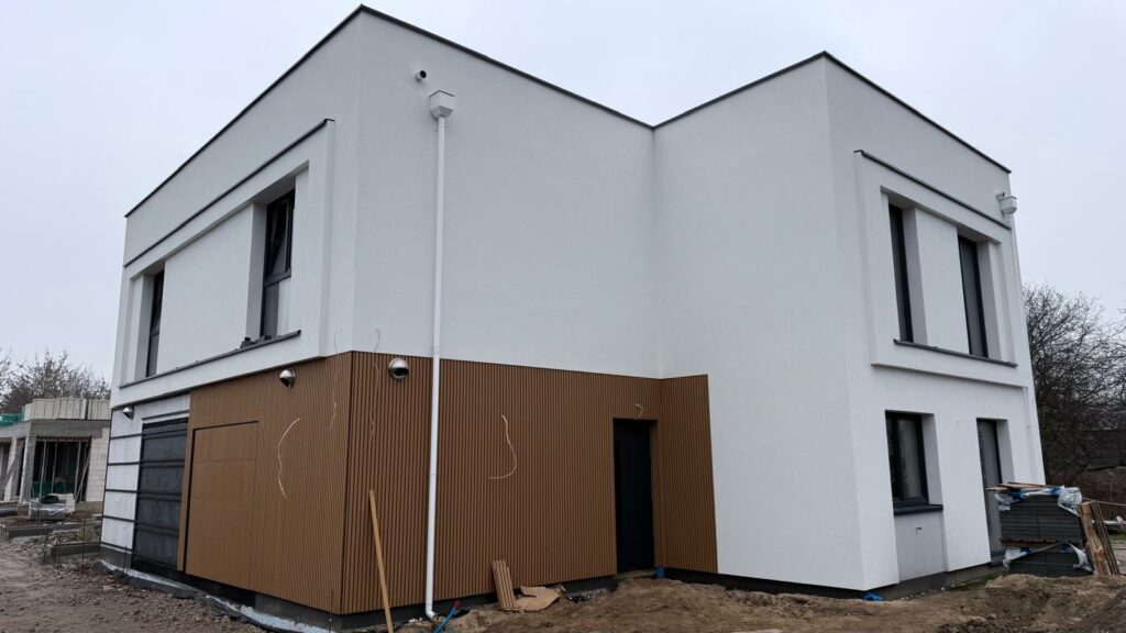 Kończymy pracę nad jednym z najważniejszych elementów elewacji – bramą garażową zlicowaną z elewację. Dodatkowo, trwają finalne prace nad drogą gwewnętrzną.